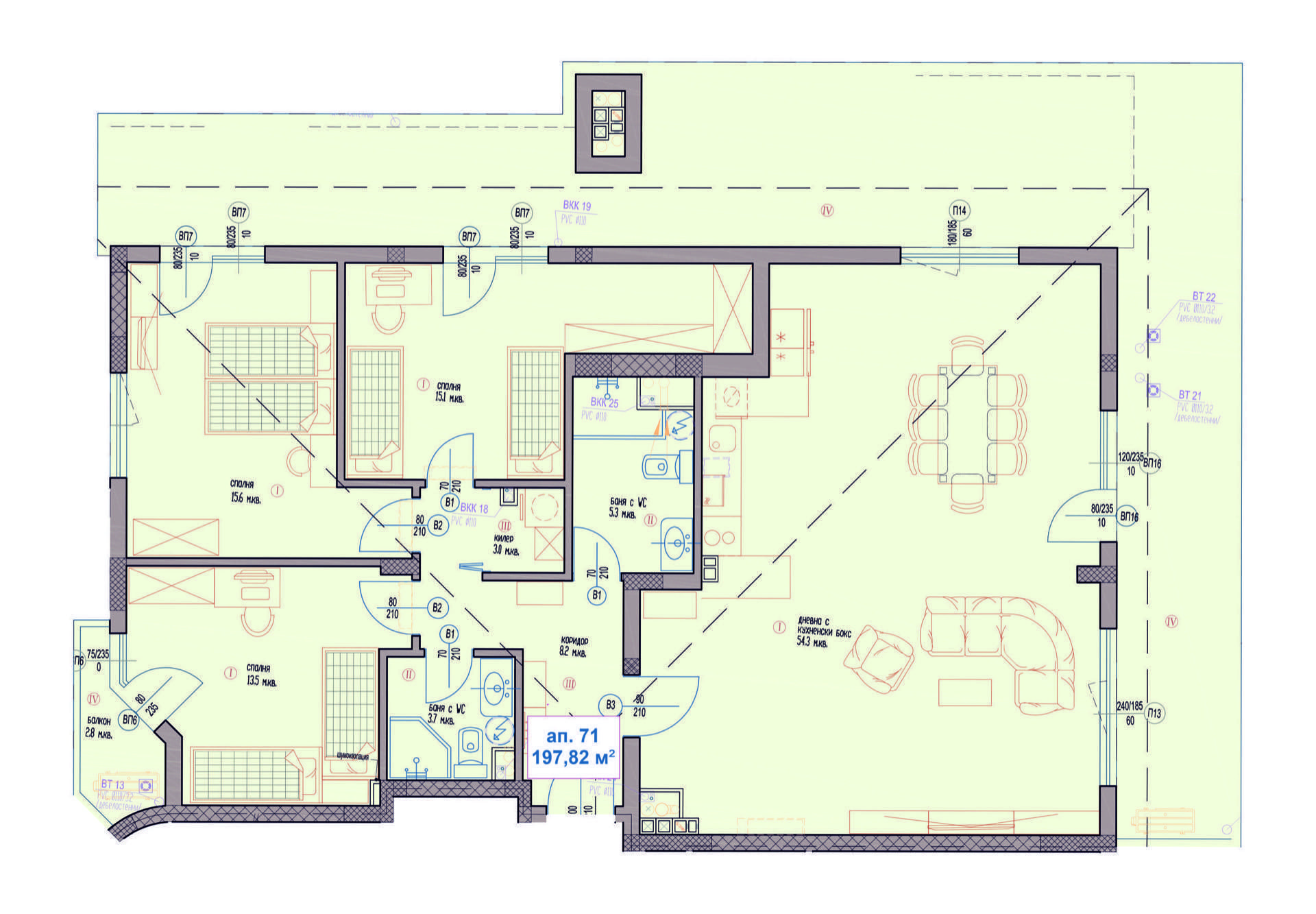 Четиристаен Апартамент Б71 ( ново строителство ) с код №: 1074761 на с площ 221,00 м2 намиращ се на етаж 17 от 17 етажа в Briz Homes - район Бриз, гр. Варна, като типа на сторителството е тухла. Дата на завършване ( Акт 16 ) , състояние на издаване на апартамента - БДС.