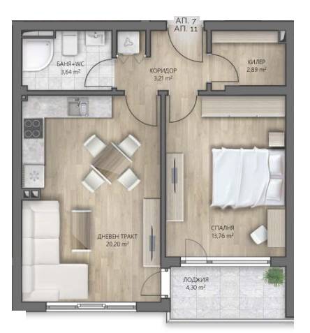 Двустаен Апартамент 11 ( ново строителство ) с код №: 1075307 на с площ 64,00 м2 намиращ се на етаж 4 от 6 етажа в Жилищна сграда Adeko - район Погребите, гр. Варна, като типа на сторителството е тухла. Дата на завършване ( Акт 16 ) , състояние на издаване на апартамента - БДС.